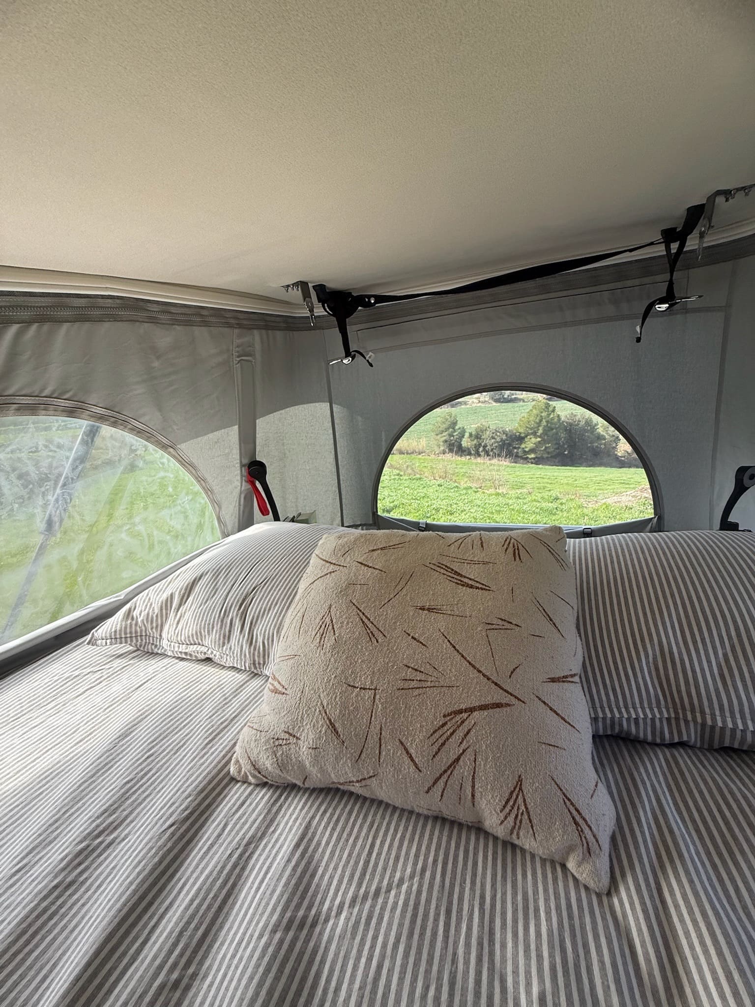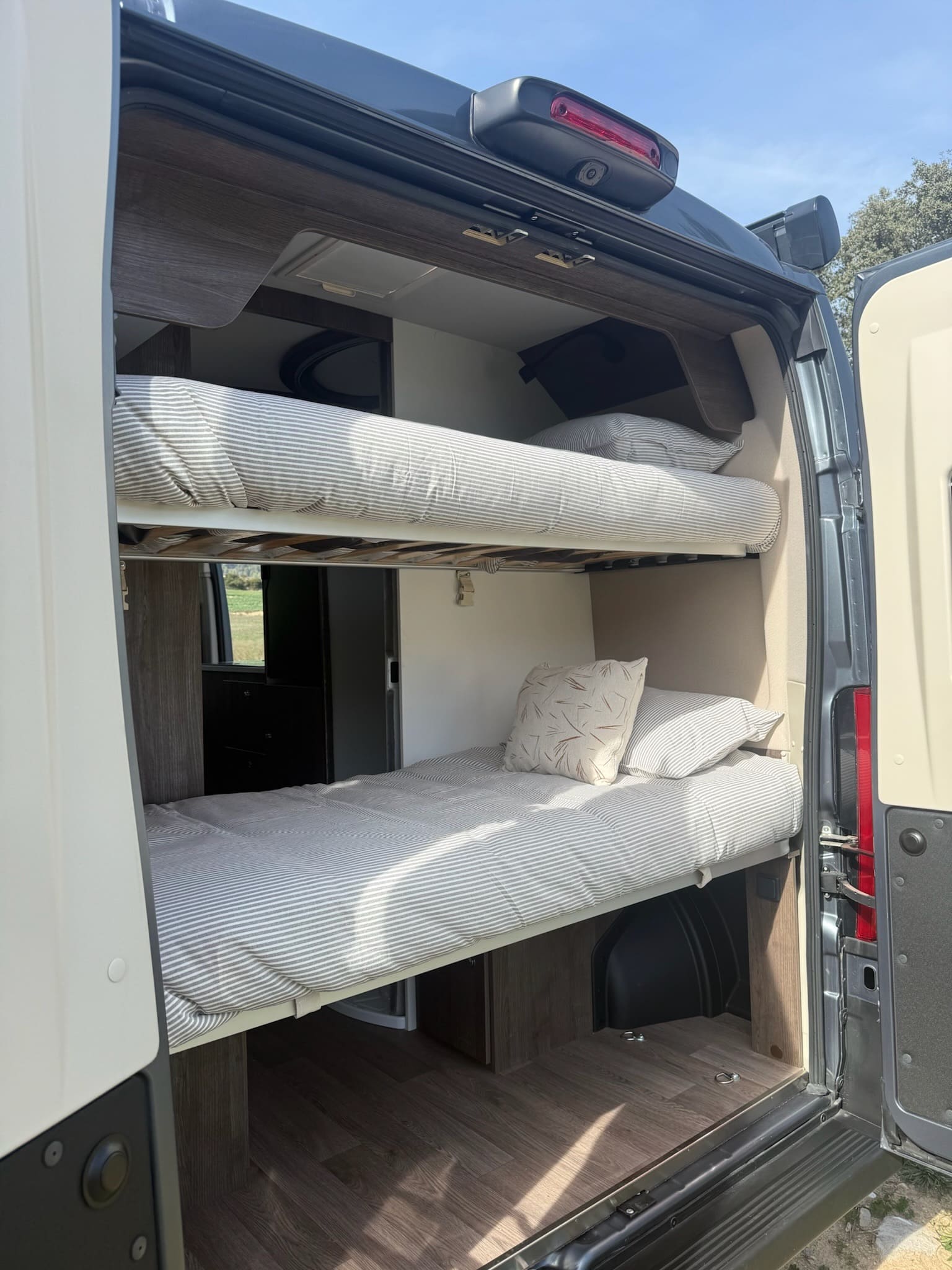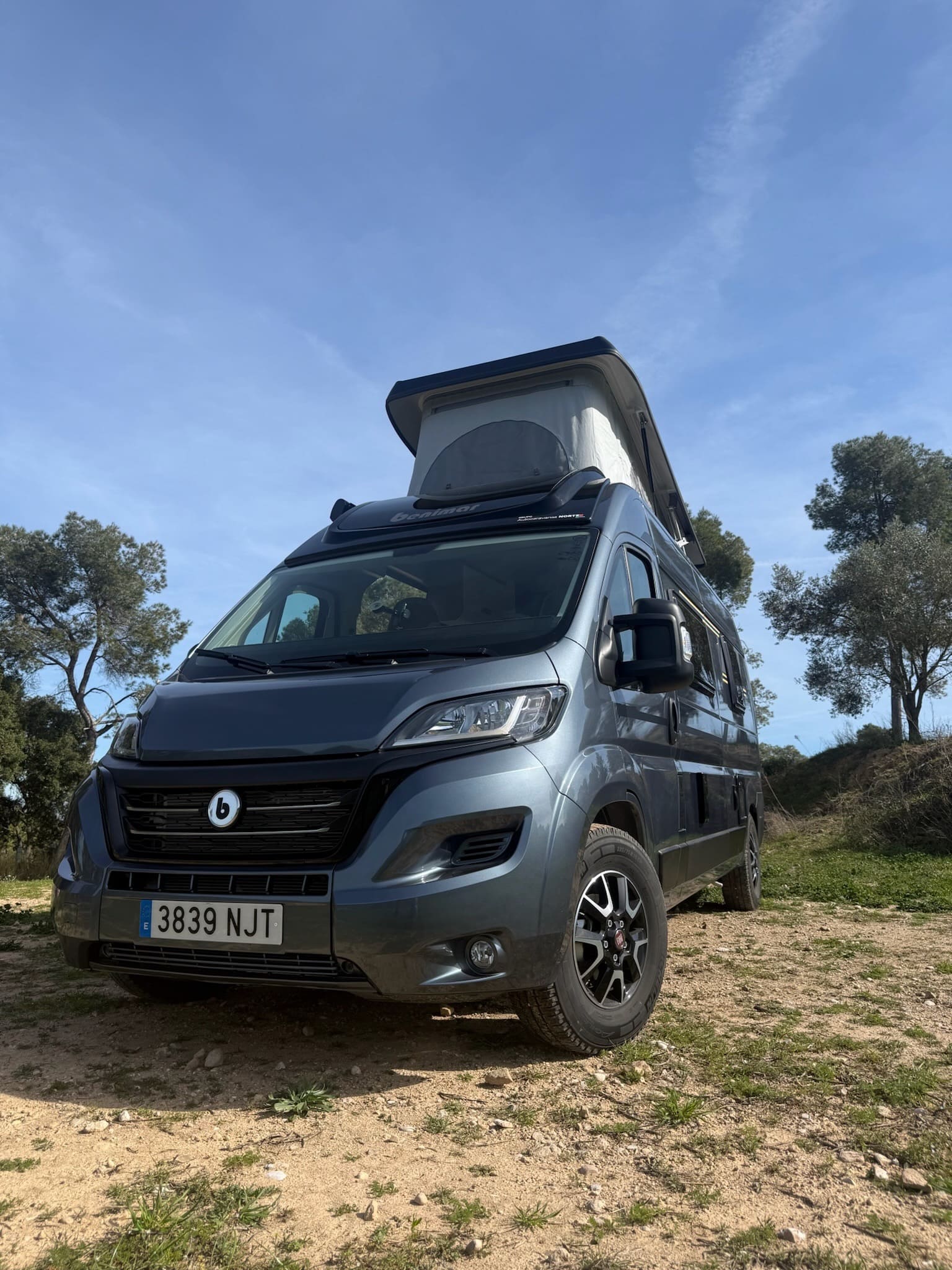 Enjoy a full and spacious bathroom , a kitchen equipped with two stoves, a sink and a refrigerator , and all the necessary utensils so you only have to think about what recipe to improvise. The space is designed for up to 5 people to travel and sleep comfortably (the fifth bed is ideal for a child). To move around without stress, you have a rear parking camera and, to enjoy the views, a panoramic roof , a pop-up roof with a double bed and a skylight that floods the interior with natural light. Relax in your indoor dining area or extend the awning and eat outdoors with the high-quality outdoor table and camping chairs , which are genuine armchairs. In addition, you'll always find a cleaning kit and toiletries , because the little details make all the difference. Renting a campervan in Barcelona has never been easier: book your adventure today and enjoy total freedom. Hop in, start the engine, and experience Marivaning.